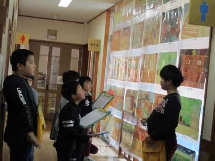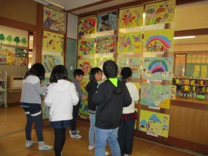 アートフェスティバルで展示されている全校生の絵を鑑賞してきました。一人ひとりががんばって仕上げた作品を真剣に見つめ、そのすばらしさを感じていました。今度は、こんなふうに描きたいなと、あこがれをもって鑑賞してきました。