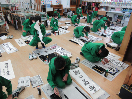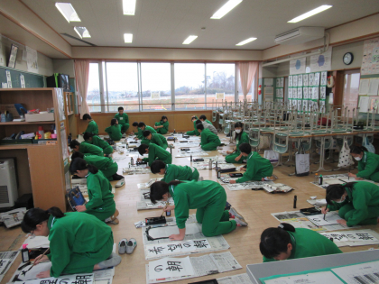 12月17日、書きぞめ展へ向けて練習をしました。「希望の朝」というなかなか難しい字を、バランスを整えて書きました!