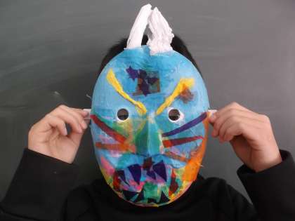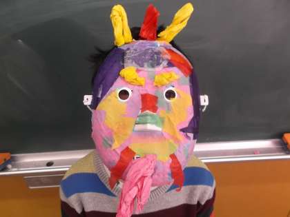 お花紙を貼り付けて、お面を作りました。2回目になるとかなりカラフルに仕上がります。いったい誰がかぶっているのか?大変気になりました。