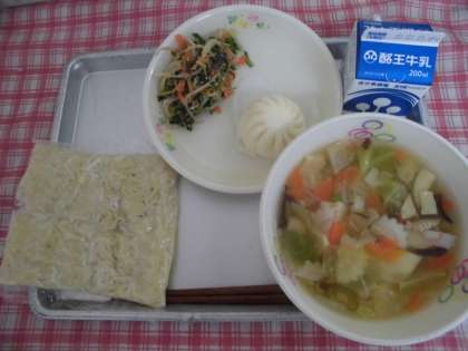 今日の給食は「ちゃんぽん麺・牛乳・ミニ肉まん・ほうれん草のナムル」です。