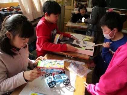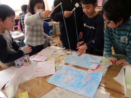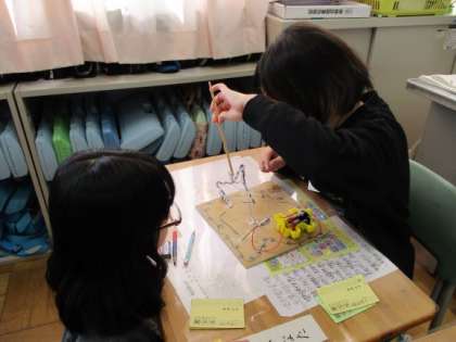 じしゃくや電気の性質などを利用して作ったおもちゃで遊びました。遊び方を説明したり、友達のおもちゃで遊んだりしながら、お互いのおもちゃの仕組みや工夫を知り、楽しく交流していました。