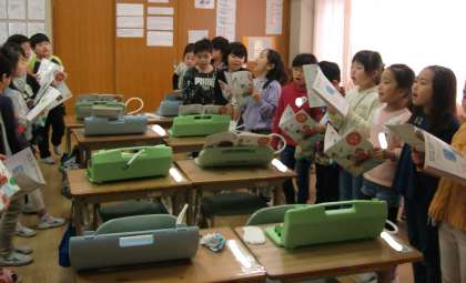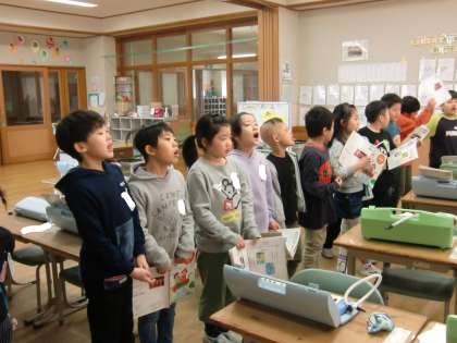 音楽科で、友達の歌声を聴きながら2つに分かれて輪唱しました。声の重なりを感じながら楽しく歌いました。