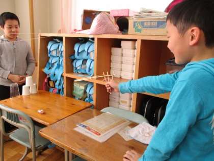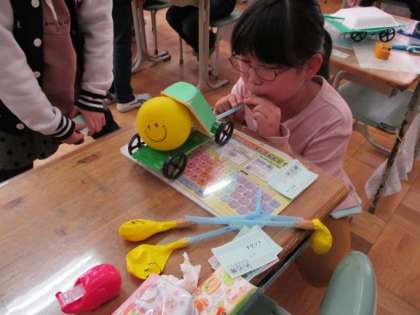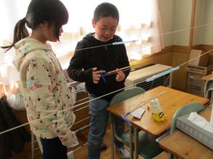理科で学習したゴムや風のはたらき、電気やじしゃくの性質を利用したおもちゃを使って遊びました。友達の作ったおもちゃを体験することで、ゴムや風、電気やじしゃくのはたらきについて再確認しながら楽しんでいました。
