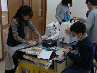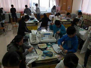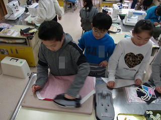 エプロンづくり始まりました。アイロンで三つ折りをつくり,しつけ縫いをしました。