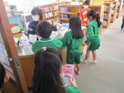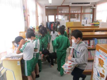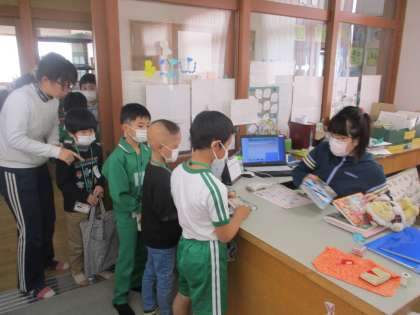 金曜日には、必ず各学級で本を借りに行きます。読みたい本を探してうれしそうに教室に戻ります。図書室には、マスクをして入ります。