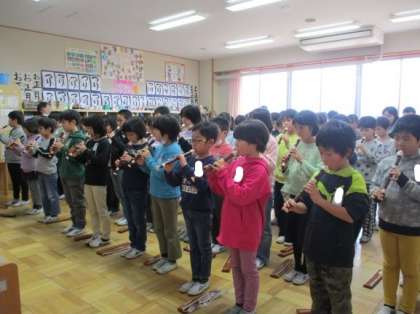 今日の5時間目は、6年生を送る会の練習をしました。6年生への感謝の気持ちを呼びかけと合奏や歌で伝えます。2回目の合同練習でしたが、前回よりも呼びかけも歌声も大きくなりました。リズムを合わせて演奏できるようにさらに、練習をしていきます。