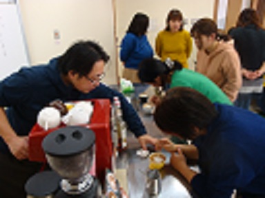 本日は、講師の先生をお呼びして「ラテアート教室」を開催しました。ラテアートとは、きめ細かく泡立てたミルクにイラストを描く「コーヒーアート」です。ひと目見るだけで、思わずにっこりしてしまいます。今回はお家でできるコーヒーアートの作り方を研修しました。