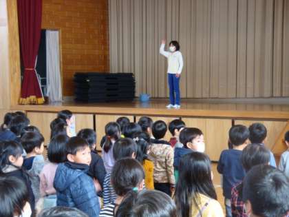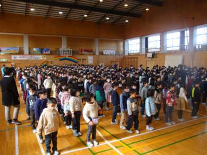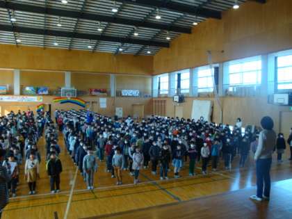 全校集会の後に6年生が退場した後に、1年生から5年生までで6年生を送る会の合唱練習をしました。お世話になった6年生のためにこころを込めて練習していました。