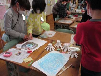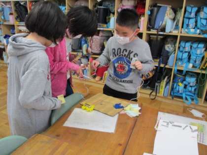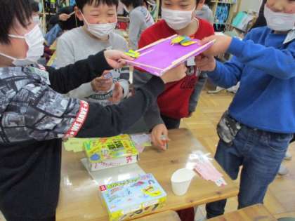 理科で作った電気やゴムを利用したおもちゃが完成して、楽しく遊びました。グループを回って友達のおもちゃの楽しさを感じたり、自分のおもちゃのよさをアピールしたりしていました。笑顔と歓声にあふれた1時間でした。