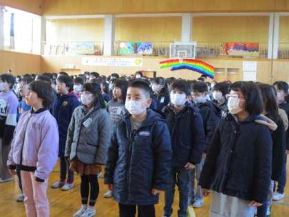 お昼休みに1〜5年生が体育館に集まって「6年生を送る会」の歌の練習をしました。6年生への感謝の気持ちを込めて練習をしました。