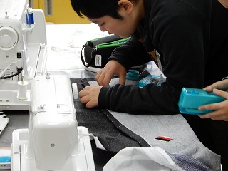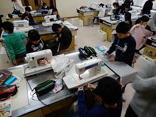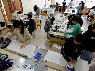 ミシンを使ってエプロンづくりをしています。ミシンの返し縫いに手間取ったり,三つ折りに手間取ったりしていましたが,だんだん形ができてきました。アイロンのかけ方も様になってきました。