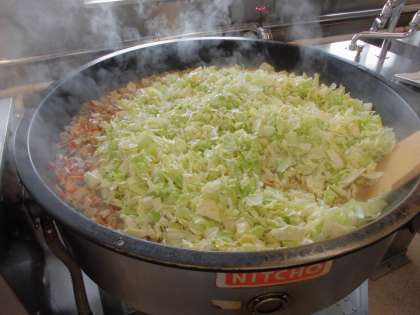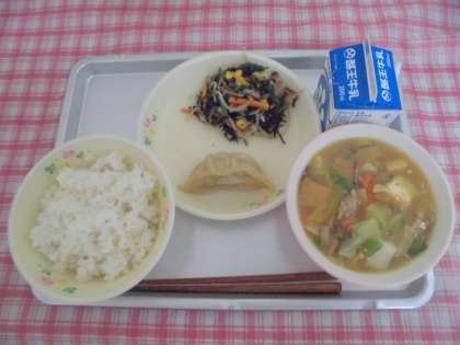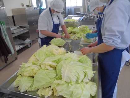 今日の給食は「麦ごはん・牛乳・生揚げの中華煮込み・ぎょうざ・ひじきのサラダ」です。生揚げの中華煮込みは、たくさんのキャベツが入り、釜からはみ出しそうでした。今の時期は、キャベツや白菜などの葉物野菜が、雪の影響で価格が高くなりますが、今年は暖冬のため葉物野菜が安いです。値段を気にすることなくキャベツをたくさん使うことができました。