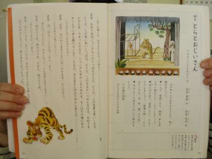 さて、次は国語の学習についてのお知らせです。教科書の128ページから「とらとおじいさん」のきゃく本があります。きゃく本とは、げきの台本のことです。まずは、このきゃく本を読んでみましょう。