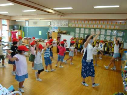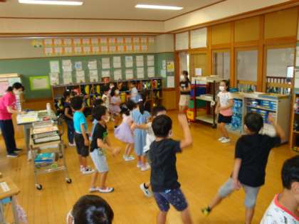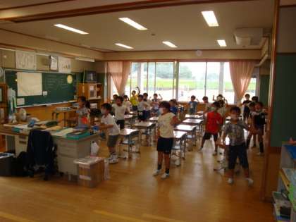 朝、新しい準備体操のダンスの練習をしています。6年生が各クラスに行って指導しています。みんな一生懸命に練習に取り組んでいます。