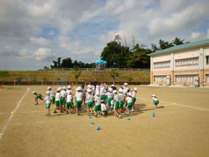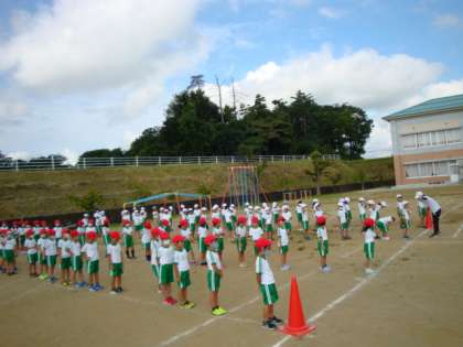 2年生の体育の授業です。運動会の練習です。朝から、暑いですが、休憩時間を多めにとり、熱中症対策を十分に行いながら行っています。活動のようすをご覧ください。