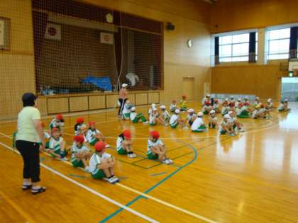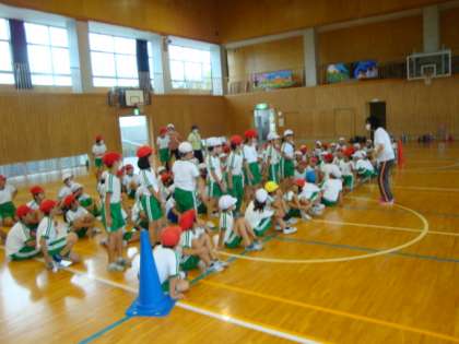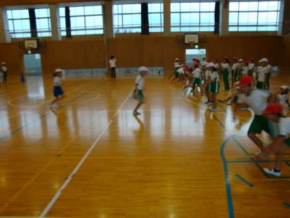 4年生の体育の授業で、運動会の練習です。雨のために体育館での練習です。外と同じように水分補給を行うための休憩時間を多めにとって、熱中症への対策を十分に取りながら練習を行っています。活動のようすをご覧ください。