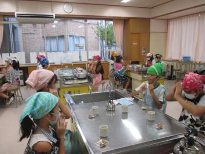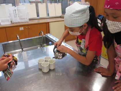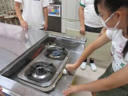 家庭科で初めてガスこんろを使いました。まずは火のつけ方と消し方を一人一人練習しました。緊張してなかなか上手くつかない友達もいましたが,なんとか全員成功しました!練習の後はグループでお湯を沸かして茶を入れ,団らんしました。皆で飲むお茶は少し苦かったようですが,楽しい実習になりました。
