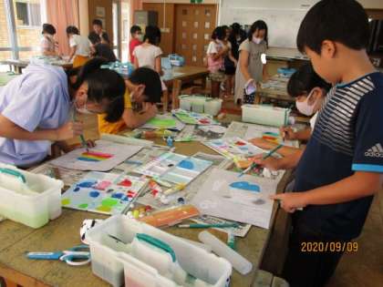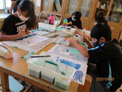 今日の図工は、刷り上がった版画に水彩絵の具で着色していきました。