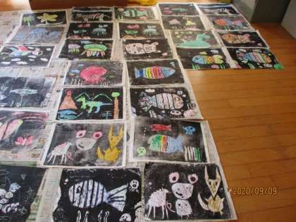 黒一色だった版画に絵の具の明るい色が入って、素敵な作品に仕上がりました。