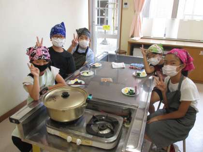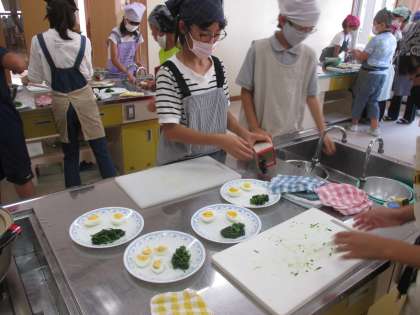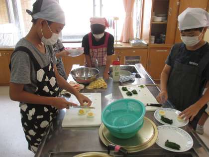 家庭科の調理実習で、ほうれん草のおひたしと、ゆでたまごを作りました。ほうれん草は沸騰してから入れ、ゆでたまごは水のうちから入れるというちがいを正しく理解して調理することができました。洗う・ゆでる・冷やす、切るなど、班の中で役割分担を決め、手際よく進めていました。自分たちで作った物を、味わいながら完食しました。