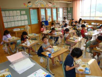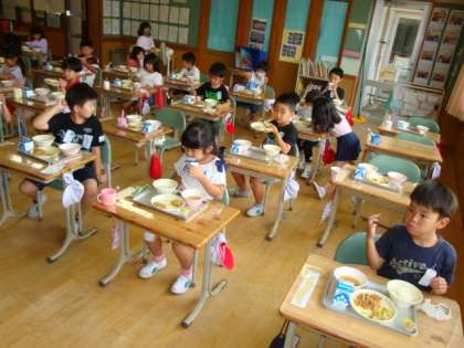 1年生の給食のようすです。今日も、調理員さんが愛情込めて作ってくれた給食を美味しくいただきました。