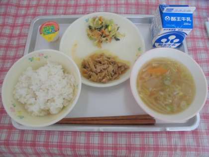 今日の給食は「麦ごはん・牛乳・豚キムチ丼・ごま風味和え・冬瓜入り中華スープ・ミニももゼリー」です。