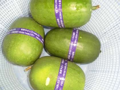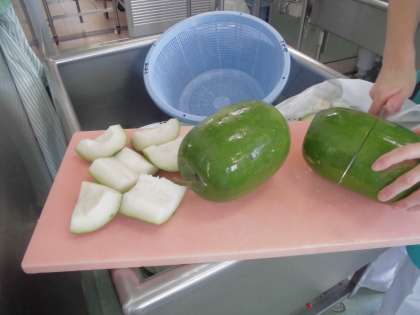夏野菜の「冬瓜(とうがん)」をつかいました。冬瓜はラグビーボールのような形をしています。皮が硬いので皮を剥いて、種をとり、スープに使いました。スープに入れると透明になり、くせがないので食べやすいです。
