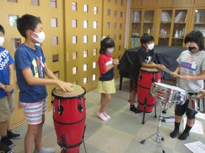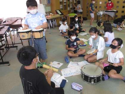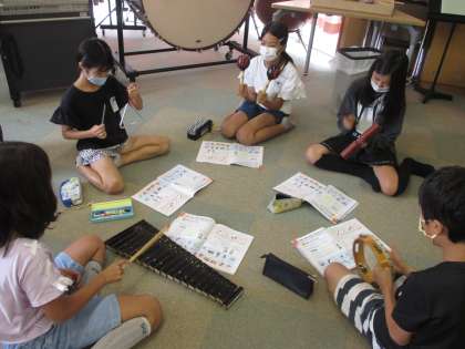 4〜5人が組になって、音色の組み合わせやリズムの重ね方を工夫しながら、リズムアンサンブルの練習を行いました。それぞれに選んだ打楽器を使って、3種類のリズムを合わせて演奏しました。
