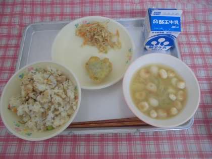 今日の給食は「切昆布ごはん・牛乳・麩のみそ汁・鯵フリッター・胡麻和え」です。
