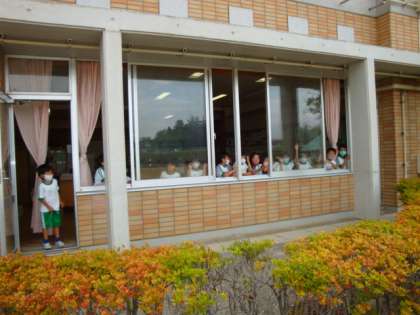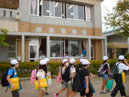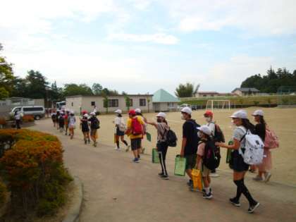 5年生が出発するときに1年生のみなさんが「いってらっしゃい」と手を振って、お見送りをしてくれました。5年生も、たいへん喜んで元気に出発しました。