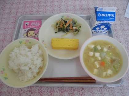 今日の給食は「麦ごはん・おかかふりかけ・牛乳・厚焼き卵・のりあえ・石狩汁」です。石狩汁は北海道で食べられている郷土料理で「鮭」が入った汁物です。寒いこの時期は、鮭と大根、人参、じゃが芋、こんにゃく、白菜、ねぎ、豆腐を煮込んだあたたかい汁がおいしいです。ほうれん草やキャベツのあえ物も食べ、野菜をたくさん使った献立でした。