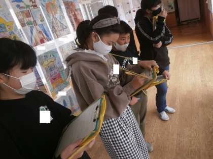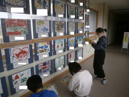 毎年恒例のアートフェスティバルが行われています。各学年の作品を鑑賞し、心に残った作品と工夫しているところを見つけてきました。たくさんの工夫されている作品を前に関心を示していました。