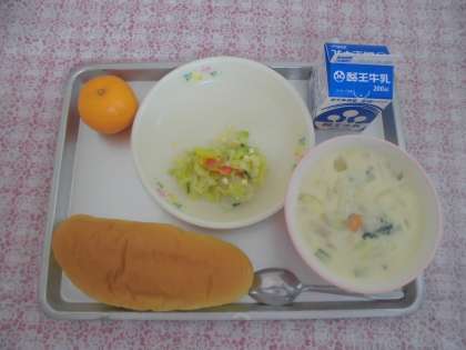 かぶや白菜、しめじなど冬が旬の野菜をシチューにいれて、キャロットパンやみかんでビタミンがたっぷりの給食でした。