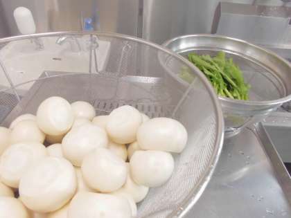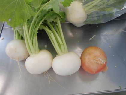 今日の給食は「キャロットパン・牛乳・冬野菜のシチュー・チーズサラダ・みかん」です。今日は郡山ブランド野菜の「あこや姫(かぶ)」をシチューに使いました。玉葱くらいの大きい「あこや姫」でした。つやがありとてもかわいい形をしていて、かぶの葉も柔らかく、とてもきれいだったので、茹でてシチューに使いました。