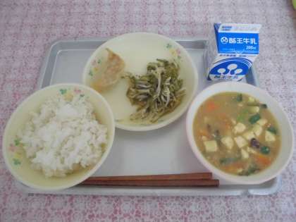 今日の給食は「麦ごはん・牛乳・家常豆腐・ぎょうざ・すき昆布香味和え」です。