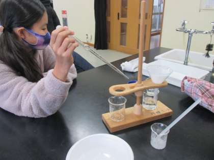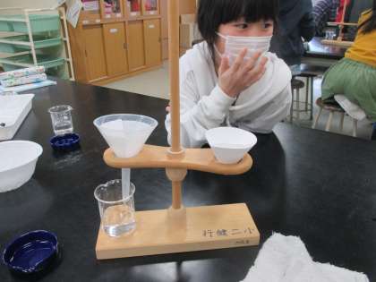 理科の実験で、食塩を水にとかして、とかした食塩を取り出すことができるかという実験を行いました。ろ紙やろうとなどの実験器具を使って行いました。