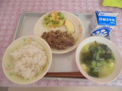「黒毛和牛」「りんご」「白菜」など、今日は福島県を味わう献立でした。霜降りの福島県黒毛和牛が入荷しました。牛肉は補助をうけたものです。玉葱と糸こんにゃくと合わせて牛丼をつくりました。牛丼なら食べやすいせいか、食が少ない子もいつもより食べていたようでした。
