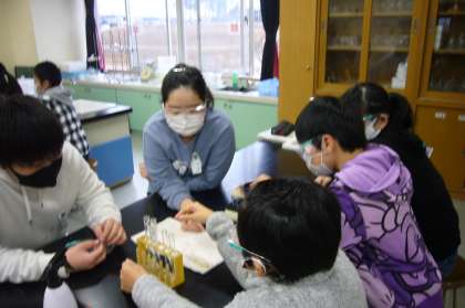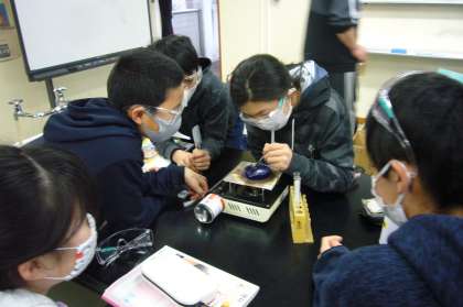 子どもたちの大好きな理科の授業の様子です。今日は、2時間続きでした。保護メガネを付けて安全に実験を行っています。