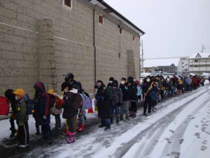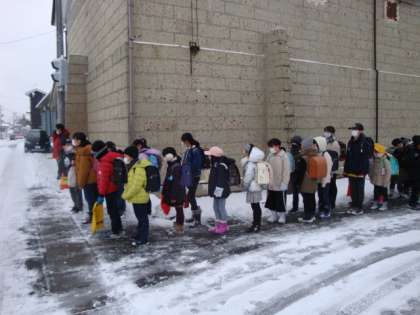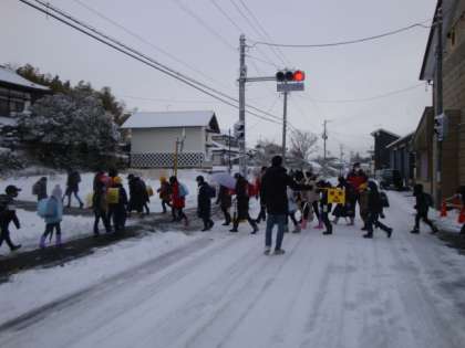 寒い中、児童のみなさんは、班長さんが先導しながら元気に登校しました。凍結した路面での登校だったので気をつけて歩いていました。凍結した路面での転倒には十分注意してほしいです。学校でも指導しますが、ご家庭もお声がけをお願いします。