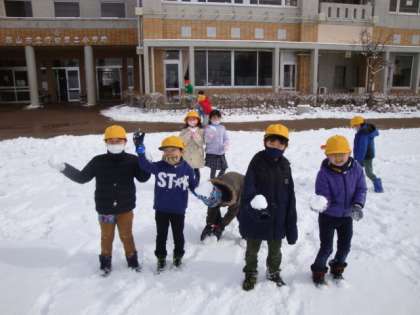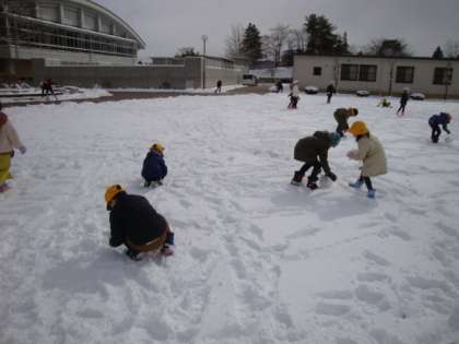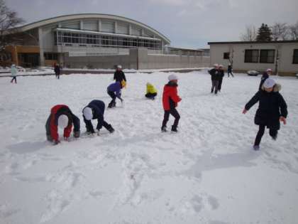 雪が積もった校庭で児童のみなさんは、思い思いに遊んでいました。元気に遊んでいるようすをご覧ください。