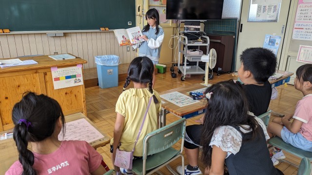 1年生の教室をのぞくと、4年生が読み聞かせをしていました。スマイル委員会の活動として、上級生が下級生に読み聞かせの活動を行っています。