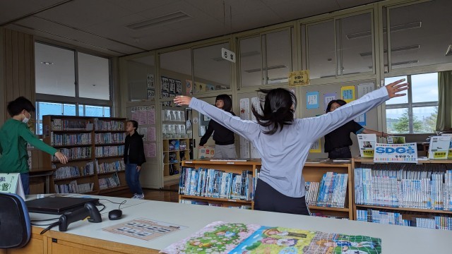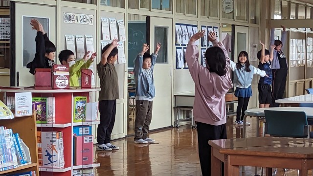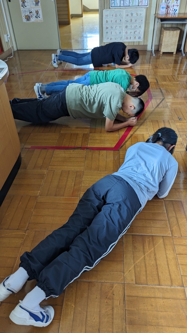 朝のマラソン後、1・2・5年生は1階ワークスペースで、3・4・6年生は2階ワークスペースで、全校生でラジオ体操→アイアイ体操(眼鏡筋・マッサージ)→さわやかチェック(健康チェック)を行いました。