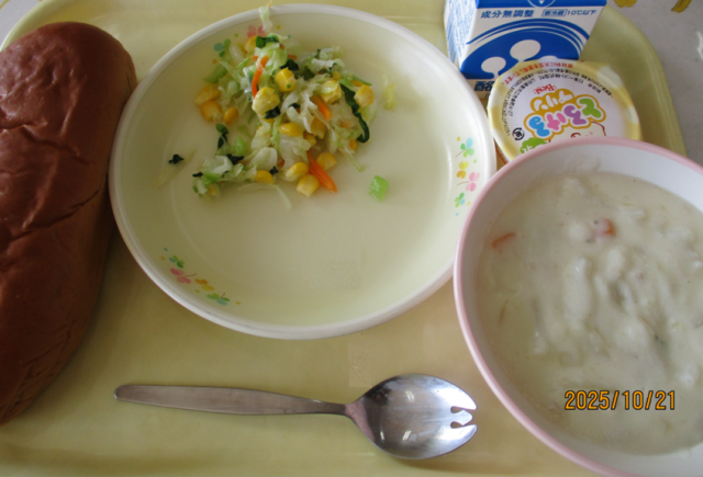 メニューは、黒糖パン、牛乳、ホワイトシチュー、コーンサラダ、大豆プリンです。