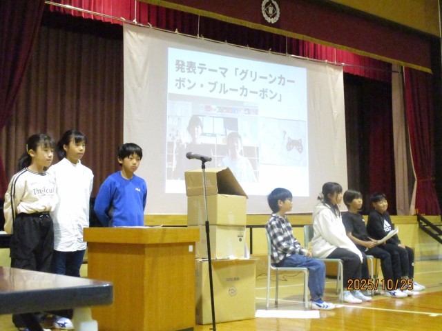 5年生は、「未来につなごう カーボンニュートラル」で、環境創造センターの見学学習や、出前講座「めざせ!カーボンニュートラル」「次世代エネルギーを知ろう」、オンライン講座「日産自動車いわき工場」など、環境にかかわる学習をしてきたことをテーマごとに分かれて発表しました。