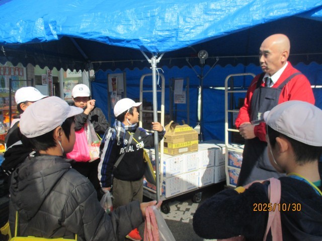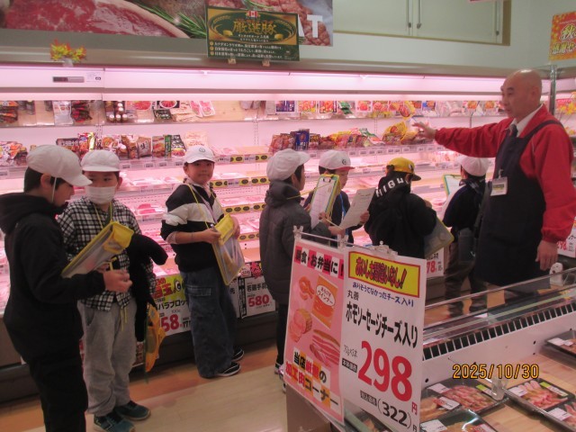 お店では、親切で優しい店長さんがお迎えしてくださいました。青果、精肉、鮮魚、総菜などの各コーナーについて、分かりやすく丁寧に説明してくださいました。また、バックヤードにも入れていただき、白菜やカボチャを切ってラップを巻く様子を見せてくださいました。家庭にはないような大きな包丁に、みんな興味津々でした。