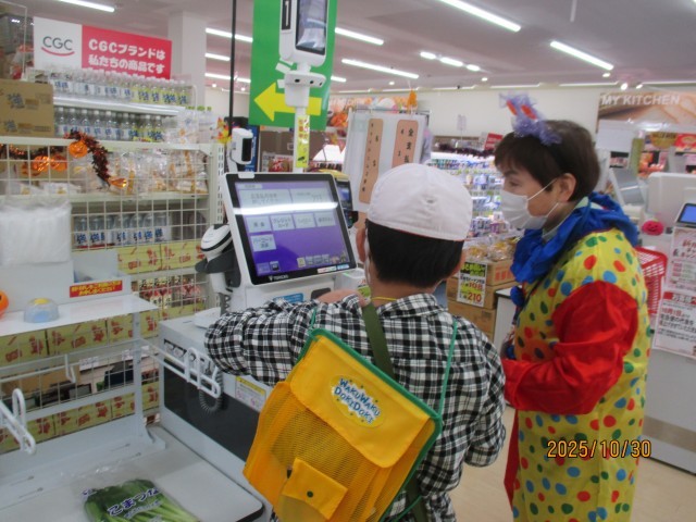 店長さんに質問に答えていただいた後は、楽しみにしていた買い物体験の時間です。おうちの方から頼まれた商品を、友だちと協力しながら探します。どうしても見つけられないときは、勇気を出して店員さんに質問する姿も見られました。セルフレジでのお支払いも体験できました。