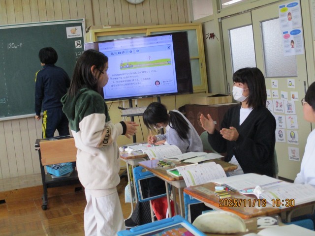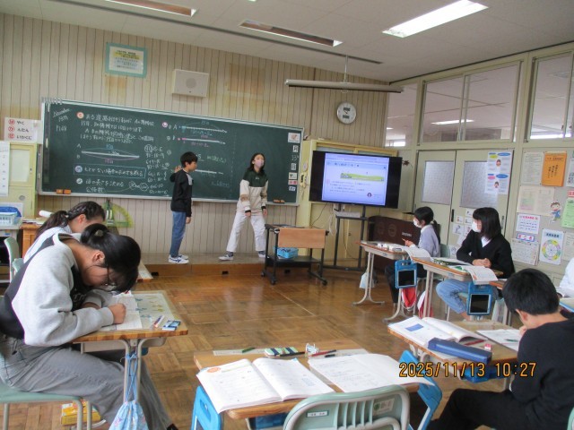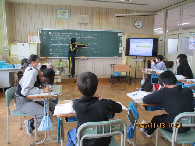 自分だけが分かればいいのではなく、クラス全員が分かるようにしようと自ら黒板で説明をする子、考え方をお互いに伝えるなどして、みんなで理解しようと授業を進めていました。
