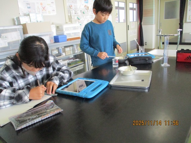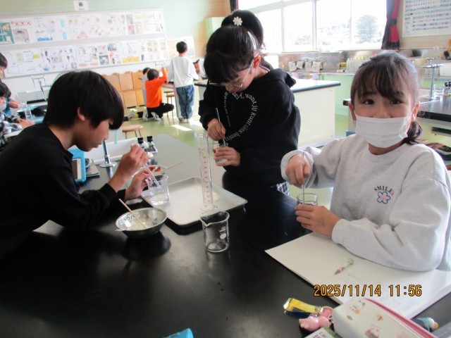 5年生の理科は、「物が水にとける量には、限りがあるのかな?」と塩とミョウバンを水にどのくらい溶けるのかを実験していました。