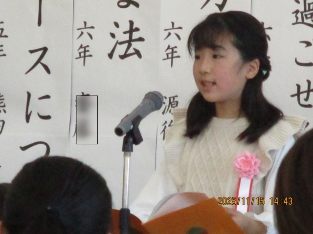 6年生は、「自然と共に生きる」という題で、地球温暖化の問題を述べ、身近な生活の中で改善できること、学校生活や家庭生活で自分ができることを実行していきたいということを発表していました。