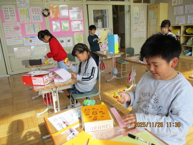 家庭から持ち寄った空き箱を使って、組み合わせたり、折り紙や色画用紙のほか、リボンやモールなどの様々な材料を使い、箱を飾り付けました。